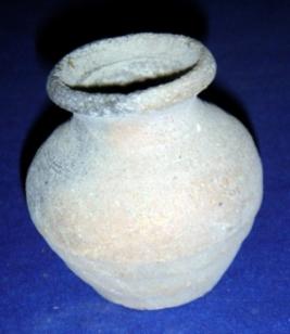 | Description / विवरण | Ill fired, tiny terracotta pitcher, with flat, circular base, bulbous body, narrow mouth and averted rim, which is slightly flaked off. Striation marks are visible both interior and exterior sides. |