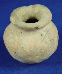 | Description / विवरण | Handmade, coarse, ill fired tiny terracotta pitcher with slightly flat, circular base, bulbous body, low neck, narrow mouth with prominent averted rim, which is partially flaked off. |