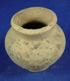 | Description / विवरण | Coarse, ill fired tiny terracotta pitcher with flat circular base, round body, broad mouth and slightly inverted rim. Close striation marks are visible on the body. |