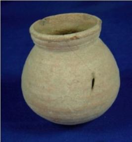 | Description / विवरण | Semi fine, glazed tiny terracotta pitcher with circular base, bulbous body broad and short neck and slightly raised rim which is partially flaked off. A small hole is seen on its body due to breakage. Close striation marks are visible on its body. |