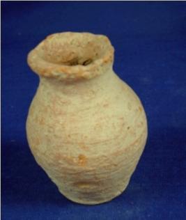 | Description / विवरण | Coarse terracotta tiny pitcher with a partly broken averted rim, narrow high neck, bulbous body and flat-circular footed base. The striation marks are prominent on the body. |