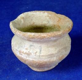 | Description / विवरण | Terracotta tiny pot, having flat, round base with marks, bulbous body, low neck, broad mouth, with thick averted rim. |