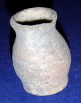| Description / विवरण | Tiny terracotta pot, ill fired, having wide mouth, vertical rim, bulbous body, and flat circular base. Body having sparse striation marks. |