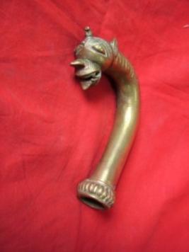 | Description / विवरण | This is a top of a walking stick in curved shape. It is dragon headed and engraved with vertical curved design. |
