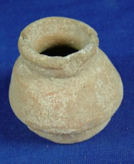 | Description / विवरण | Tiny pot, coarse, with averted rim and short neck, carination on lower body and circular footed base. |