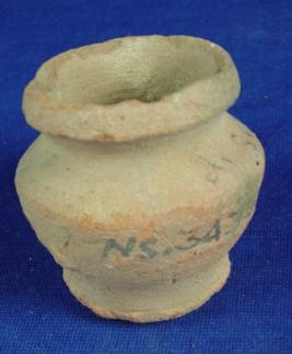 | Description / विवरण | Tiny pot, coarse, having inverted rim circular body with carination mark in middle and broken circular base. |