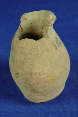 | Description / विवरण | Tiny pot, coarse ill fired, with broken averted rim, conical body and circular base. |