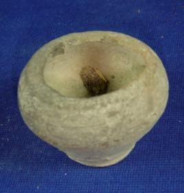 | Description / विवरण | Terracotta vessel - tiny pot, crudely finished and ill fired with missing rim and neck, rounded body with sparse striation marks and footed base. |