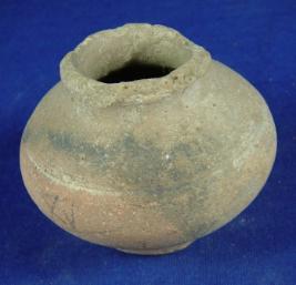| Description / विवरण | Semi fine, ill fired tiny terracotta pot with flat-circular base, round body, broad neck with slightly averted rim which is partially broken. Close striation marks are seen on the waist. |