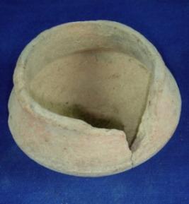 | Description / विवरण | Ill fired, coarse terracotta tiny pot, thick in fabric and with broken featureless rim, carinated circular body and flat circular base. |