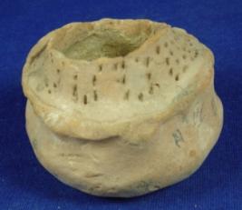 | Description / विवरण | Terracotta pot, hand made, ill fired with broken rim and neck, round body with incised marks on its upper part and flat, circular base. |