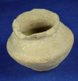 | Description / विवरण | Terracotta pot, ill fired, coarse, with averted rim broken from one side, circular body with sharp carination and flat circular base. |