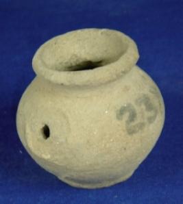 | Description / विवरण | Plain, terracotta coarse vessel - tiny pot with broad mouth, inverted rim, low neck, bulging body and broad circular, flat base. The waist has a perforated hole and provision for probably the spout, which is missing. |