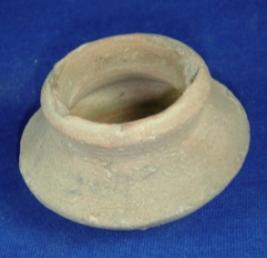 | Description / विवरण | Plain, terracotta coarse vessel - tiny pot with broad mouth, averted rim with concavity below, circular body and broad circular flat base. It has sharp carination at the waist and the diameter of the rim is more than the base. There is a crack mark around the base. |