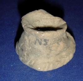 | Description / विवरण | Terracotta coarse vessel - tiny pot with feature less rim with concavity below, round body and base. The waist has carination with oblique cut design. It is handmade, crudely finished and ill fired with black core. |