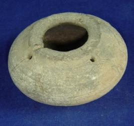 | Description / विवरण | Coarse and ill fired terracotta tiny jar, has round base and round body, featureless rim. There is perforated hole below the rim in four coordinate points. There is a crack on the body. |