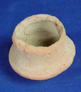 | Description / विवरण | Coarse terracotta tiny pot, having footed circular base, highly carinated bottom part of the body and featureless rim. Portion of rim are broken. Clay incrustation is on the pot. |