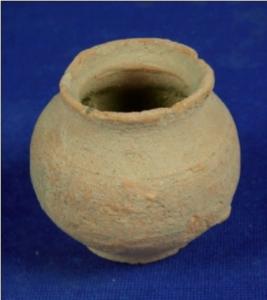 | Description / विवरण | Coarse terracotta tiny jar of broad mouth, averted rim with concavity below, round body and flat circular base. There is a hole at the base. Sparse striation marks are on the exterior and interior parts of the pot. There is earthly incrustation on the pot. |