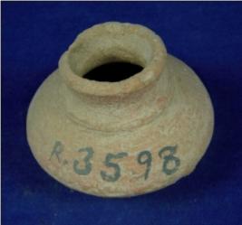 | Description / विवरण | Coarse tiny terracotta pot with circular flat base, flayed body, long, narrow neck with thin featureless rim. Carnation mark is visible below the neck and a hole in seen at the centre of the base. |
