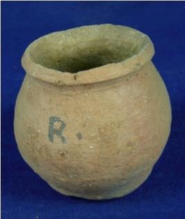 | Description / विवरण | Coarse terracotta vessel - tiny pot with averted rim with concavity below, bulbous body and broad, flat and circular base. |