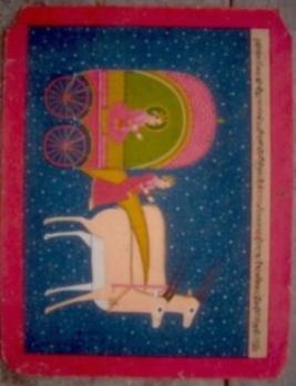 | Description / विवरण | The painting depicts chandra dev seated on a decorative cart pulled by deer bigger in proportioin along with a man seated in front. The ground is blue with white star shaped dots. |