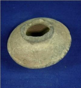 | Description / विवरण | Semi fine terracotta tiny pot with thick, partly broken inverted rim, narrow neck, Flayed body, and a flat circular footed base. The body is highly carinated. |
