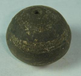 | Description / विवरण | Round, perforated terracotta bead having a flat hole end with depression. It has sparse striation marks. Part of the middle body is peeled off. |