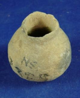 | Description / विवरण | Crudely finished, hand made, ill fired terracotta tiny spouted pot with featureless rim, broken spout, bulbous body |