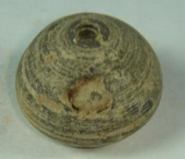 | Description / विवरण | Perforated terracotta bead, betel nut in shape, with a slight depression on the body and concentric circles are clearly visible on the body. Clay incrustation all over. |