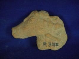 | Description / विवरण | Terracotta head of a horse, whose eyes, ears, mouth and nose are prominent. A part of rein is also visible on both the side of the head. |