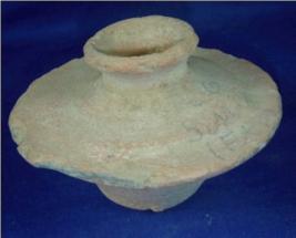 | Description / विवरण | Terracotta lid cum miniature vase, tapering lower part and flat circular base. It has narrow neck and broad mouth with thick rim. Portion of the body is broken. |