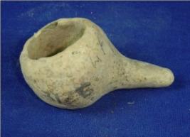 | Description / विवरण | Coarse terracotta vessel - miniature container to pour oil. It has a circular bowl with spout attached to it. It is hand made and crudely finished. |
