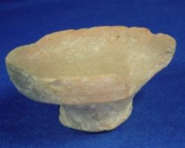 | Description / विवरण | Terracotta pedestal lamp with transverse perforation at the base. The rim is partially broken. |