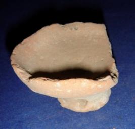 | Description / विवरण | terracotta lamp with Pedestal, broken from sides, with transverse perforation at base, probably to tie several lamps in a row. |