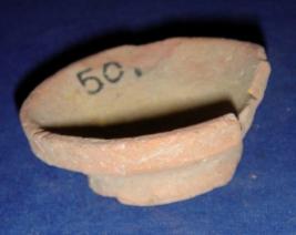 | Description / विवरण | Plain, terracotta coarse vessel - small shallow lamp with low pedestal. Part of the rim is broken. |