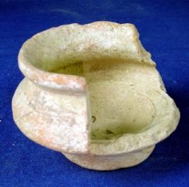 | Description / विवरण | Fragment of a terracotta pitcher with vertical rim with concavity below, round body and flat circular footed base. |