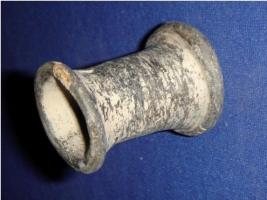 | Description / विवरण | Deluxe terracotta spindle whirl in a shape of pitcher with small body of oval base, long neck and thick and averted rim. The top of neck has 2 holes. Earthly incrustation all over. |