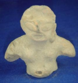 | Description / विवरण | Terracotta pot bellied human figurine, probably male. The head is pinched upwards the eyes, lips are in applique work. Fragment of necklace is visible at left side. The figure has small breasts and pierced naval point. The arms below the shoulders and body below the belly are broken. It is ill fired with black core. |