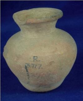 | Description / विवरण | Terracotta vessel - pitcher having a round body and a conical flat base. The mouth is narrow with low neck and a thick averted rim. |