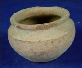 | Description / विवरण | Terracotta vessel - pitcher having round body, flat circular base, thick averted rim and wide mouth. The body has carinated waist. |