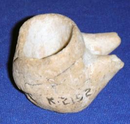 | Description / विवरण | Handmade, coarse, miniature terracotta spouted vessel with slightly flat base, round body and featureless rim which is partially broken. Two spouts are seen on its body, tip of one is broken. |
