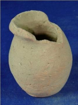 | Description / विवरण | Terracotta pot with flat base, drum shaped body, low neck and slightly averted rim. Part of rim and neck are broken. |
