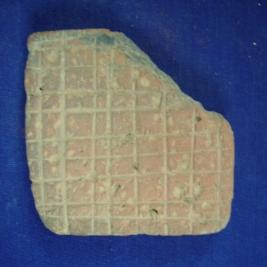 | Description / विवरण | Terracotta tablet, square in shape with chequered designs in one surface and other is plain. One corner is broken. |