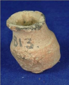 | Description / विवरण | Tiny terracotta pot with narrow neck, broad mouth, thick rim and flat base. This object is crudely finished. |