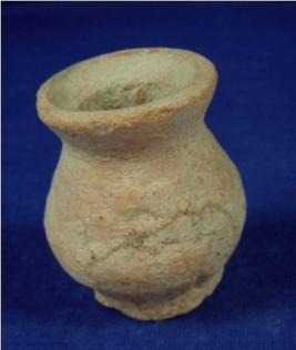 | Description / विवरण | Tiny terracotta pot with narrow neck, thick rim and a flat circular base. The body is bulbous and without any decoration. |