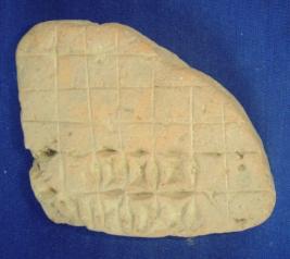 | Description / विवरण | Triangular terracotta tablet having chequered and concave square design. On one side, the other surface is plain. |