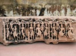 | Description / विवरण | This is a part of female head. It is hair is curly in front portion. She is wearing head ornament in center Called Tikka . Its ears are also decorated with ornaments. She wears a neck collar. Its eyes nose and lips are well carved. It has eyebrow are arched type with half open eyes. |