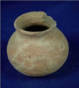| Description / विवरण | Plain terracotta vessel-small pot, with narrow mouth, round body and flat base. The close striation marks are visible on the body. The rim is slightly broken at one side. |