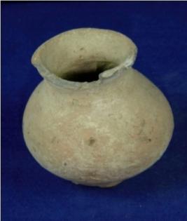 | Description / विवरण | Terracotta small pot of round cylindrical body tapering down and forming round circular base. The upper part has narrowing neck with broad mouth end thick averted rim. Portion of the rim is broken. |
