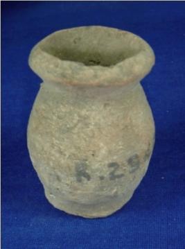 | Description / विवरण | Coarse terracotta vessel - pot with flat circular base, cylindrical body, low neck and thick and averted rim. The mouth is broad and it is ill fired signified by its colour . |